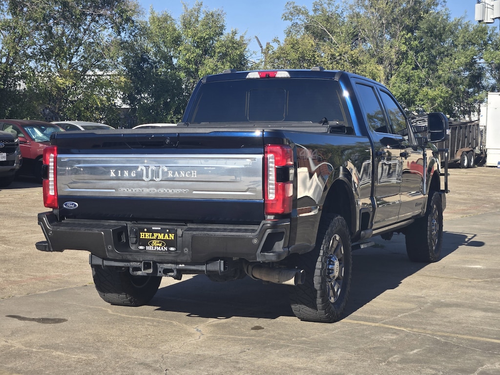 Wheels w/Chrome Hub Covers, Voice Activated Dual Zone Front Automatic Air Conditioning w/Steering Wheel Controls, Urethane Gear Shifter Material, Upfitter Switches, Unique King Ranch Leather 40/Console/40 Seats -inc: multi-contour Kingsville Antique Affect leather seating surfaces, dual integrated cupholders in armrest, 2 outboard head restraints, heated/ventilated seating, 8-way power driver and passenger seat (4-way power-adjustable track, 2-way power recline and 2-way power lumbar), 2-way adjustable driver/passenger headrests and easy entry driver's seat w/memory, Trip Computer, Transmission: TorqShift 10-Speed Automatic -inc: SelectShift and selectable drive modes: normal, eco, slippery roads, tow/haul and off-road, Transmission w/Driver Selectable Mode and Oil Cooler, Trailer Wiring Harness, Tires: LT275/65Rx20E BSW A/T -inc: Spare may not be the same as road tire, Tire Specific Low Tire Pressure Warning, Tailgate/Rear Door Lock Included w/Power Door Locks, SYNC 4 w/Enhanced Voice Recognition -inc: 12 LCD capacitive touchscreen w/swipe capability, information on demand panel, wireless phone connection, cloud connected, AppLink w/app catalog, 911 Assist, Apple CarPlay and Android Auto compatibility, digital owner's manual, conversational voice command recognition and connected navigation for eligible vehicles that begins on the new vehicle warranty start date, Customers must unlock the navigation service trial by activating the eligible vehicle w/a FordPass member account, If not subscribed by the end of the complimentary period, the connected navigation service will terminate, and the system will revert to embedded offline navigation, Navigation services require SYNC4 and Ford Pass Connect (optional on select vehicles), complimentary connect service and the FordPass app (see FordPass terms for details), Connected service and features depend on compatible AT&T network availability, Evolving technology/cellular networks/vehicle capability may limit functionality and prevent operation of connected features, FordPass app, compatible w/select smartphone platforms, is available via a download, Message and data rates may apply, Steel Spare Wheel, Solid Axle Rear Suspension w/Leaf Springs.